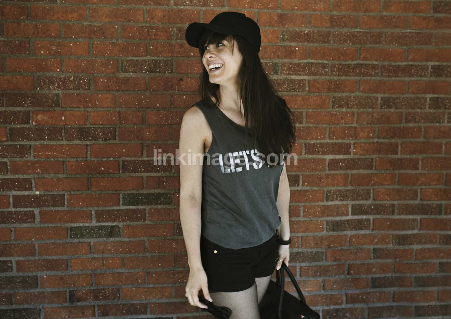 - woman, cap, hair, pile, letters, shorts, brick, wall, laughter, laugh, happy, smile, moment, turn, sunglasses, white, teeth, purse, sidelong glance, linen, latina, hispanic, argentine, argentines, city, urban, summer, happiness, relaxed, relaxed, fighter