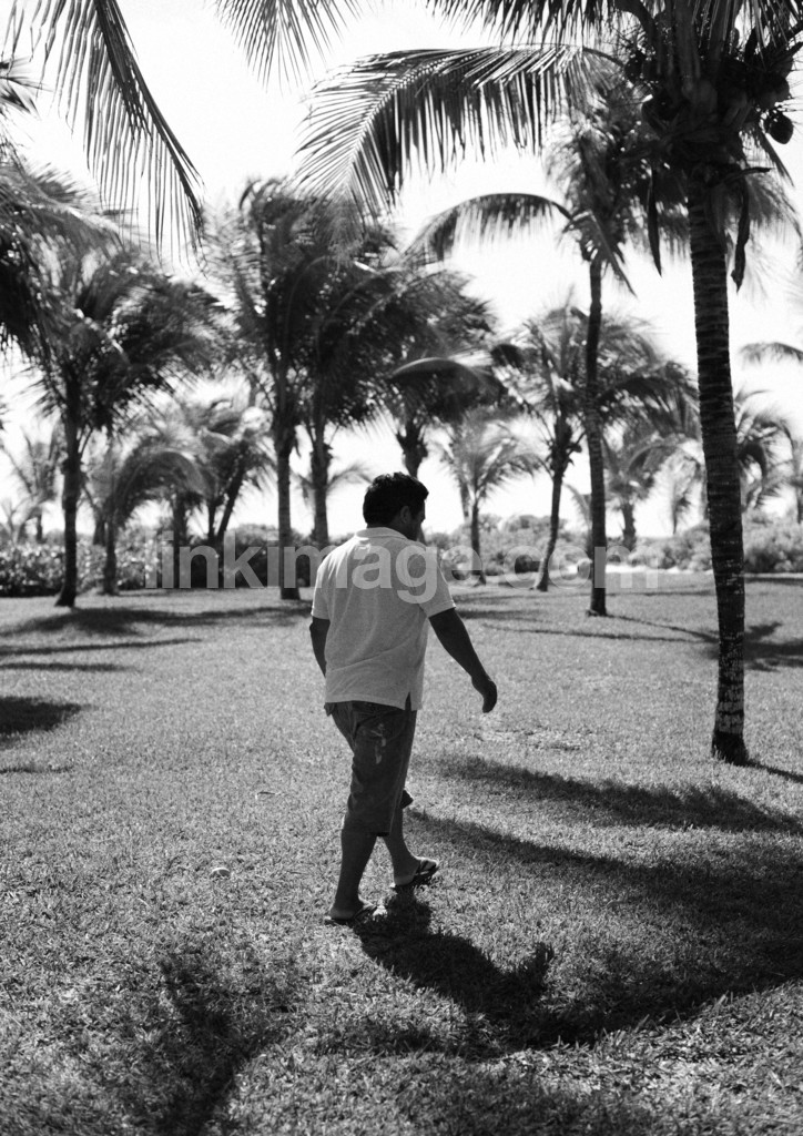 - one, mexico, mexicans, mexican, transient, go, palm trees, black and white, shadow, back, target, trip, destination, leave, on, road, lawn, grass, shorts, t-shirt