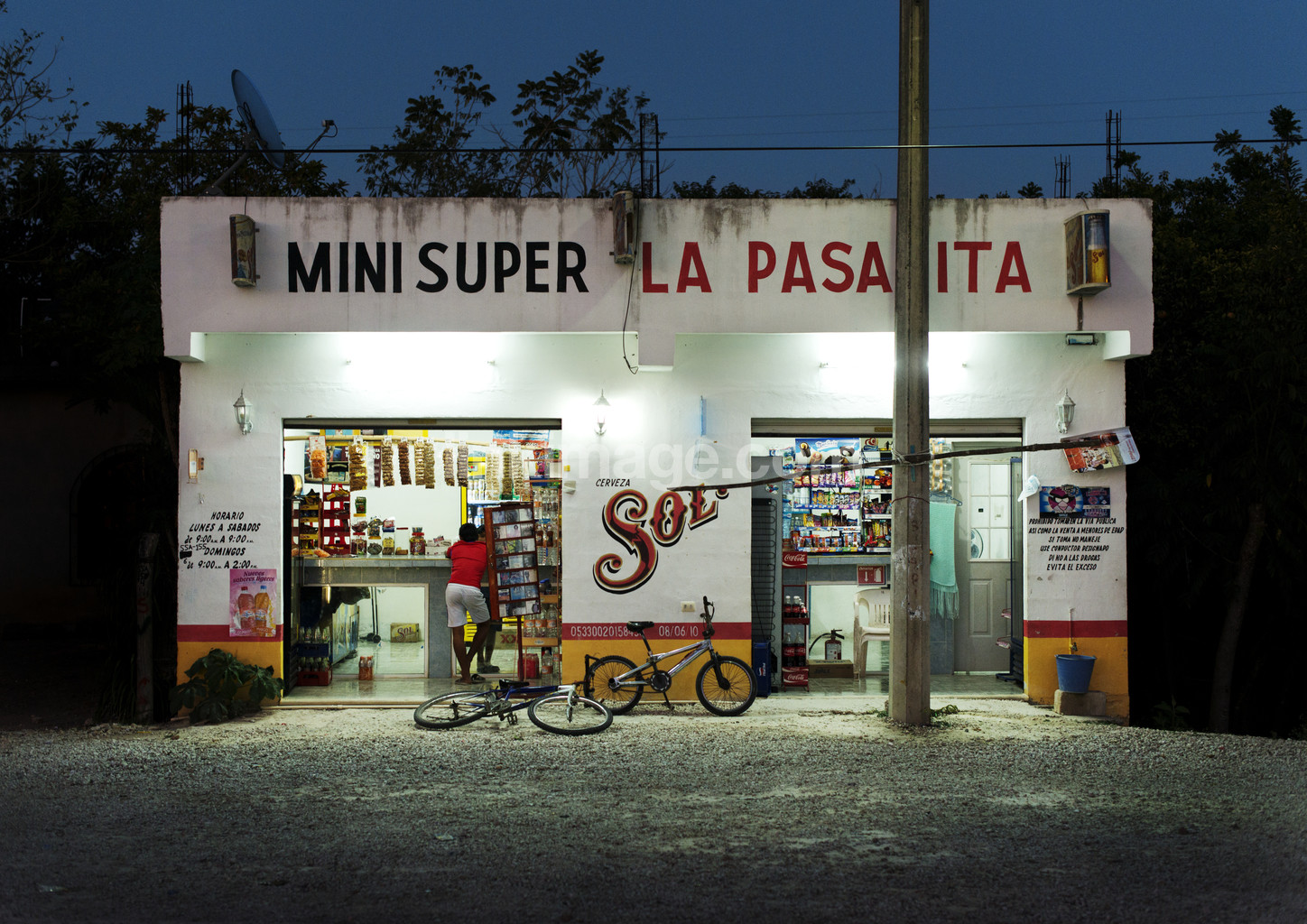 - mexico, sun, beer, cycle, boy, mexicans, mexican, post, night, sky, lighting, lamp, dish, satellite, antenna, store, business, exotic, fluorescent, green, yellow, red, blue, white, alone, buyer, buy, goods, sales, local, road, single, cable, snack, fast food, coke, coke, street