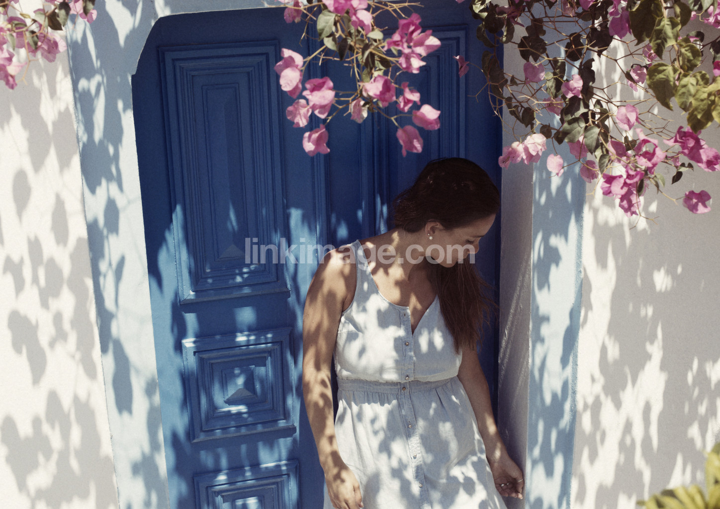 - woman, argentines, argentine, latina, hispanic, flowers, door, blue, white, pink, shadow, dress, summer, holiday, sun, hot, relaxed, relaxed, happy, satisfied, greece, think, thinking