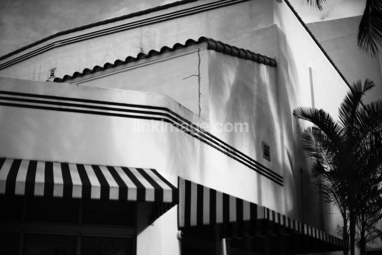 - concrete, building, window, house, lines, awnings, palm trees, shadow, city, urban, black and white, ceiling, wall