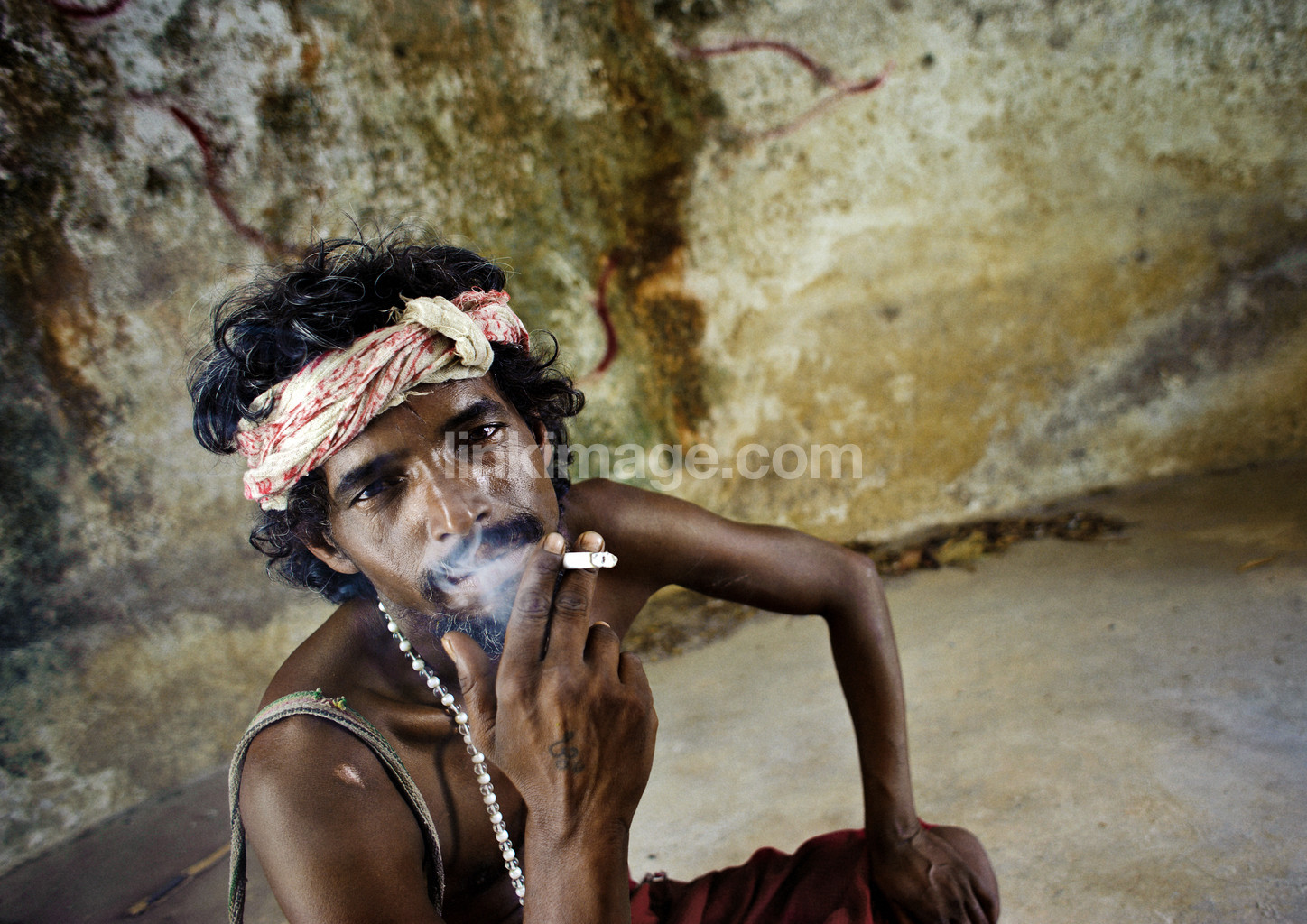 - one, cigarette, smoke, beard, bandana, headbands, tattoo, symbol, thin, lean, scar, religious, eye contact, marijuana, high, india, poor, wall, graffiti, smuttsig, blowing, intense, gaze, staring, concentrated, concentration, focused, focus