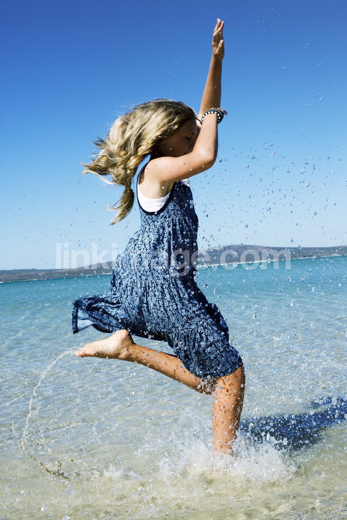 child, blue, girl, jumping, dress, play, playing, frolicking, summer, beach, water