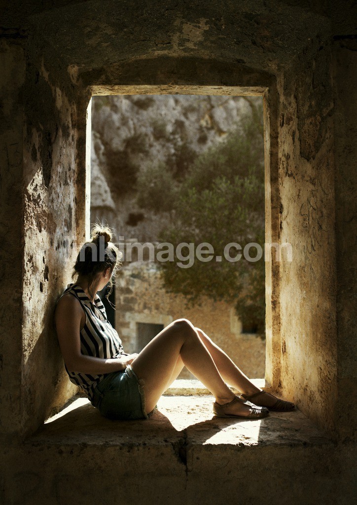 - female, argentines, argentine, latina, hispanic, sit, sitting, sun, vacation, summer, hot, gold, yellow, view, watch, viewing, browse, searching, relaxed, relaxed, rest, dormant, window, old, ruin, monastery, bone, sandals, shorts, striped, stone, concrete, tree