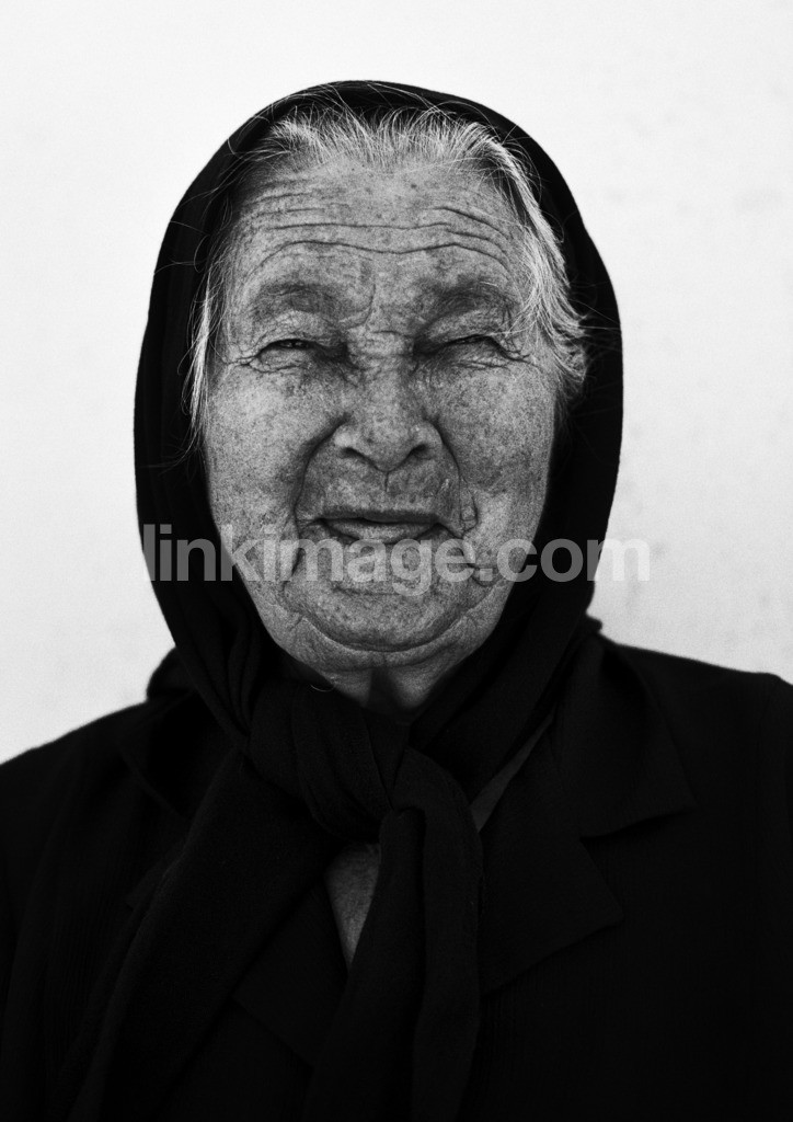- old, happy, greek, greece, gray-haired, cute, headscarf, plug, female, smile, portrait, funny, wrinkles, veil, black, dressed in black, black and white, toothless, vis, widow, widow, honest, honesty, eye contact