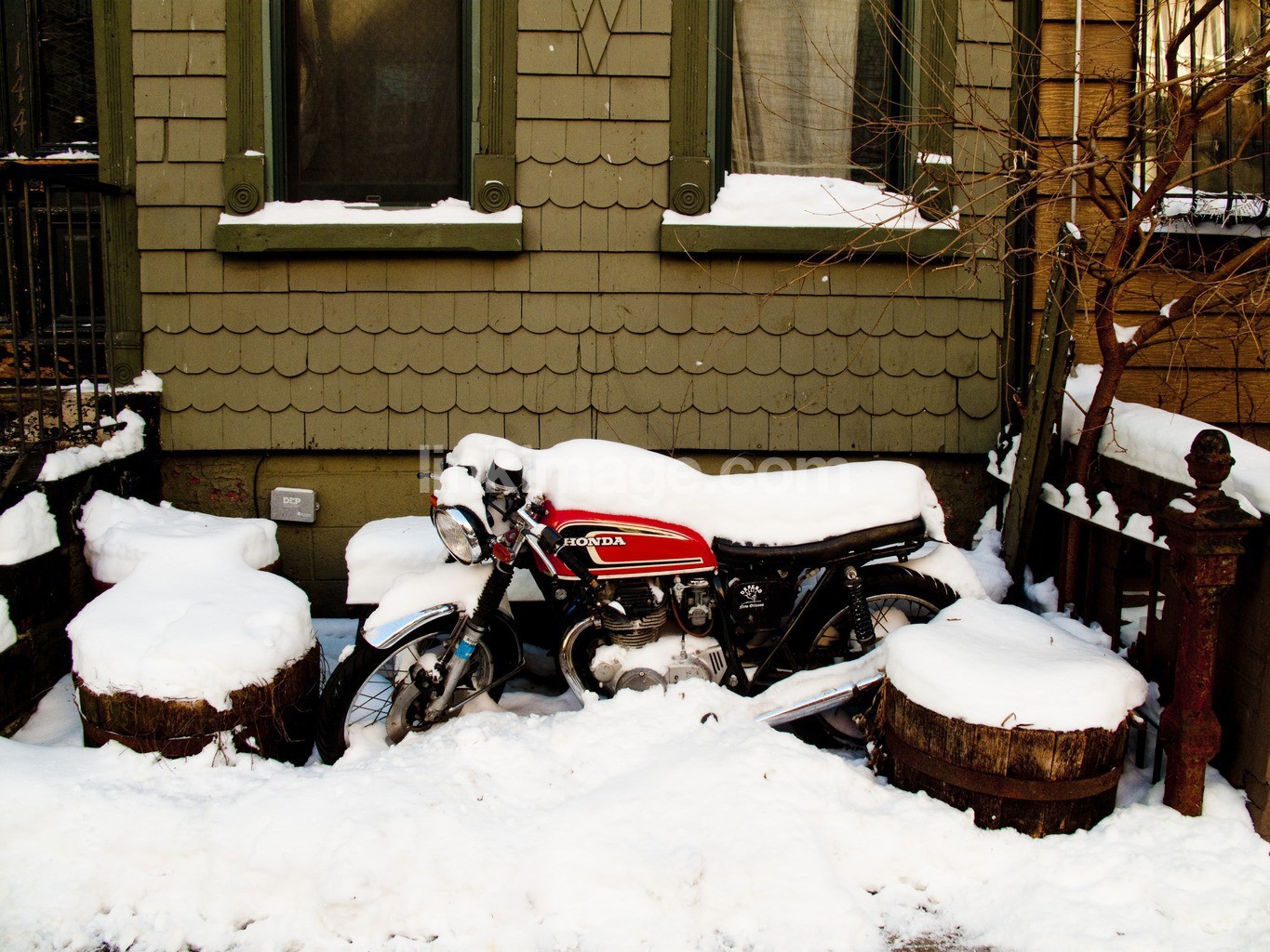 - mc, motorcycle, backyard, farm, house villa, snow, winter