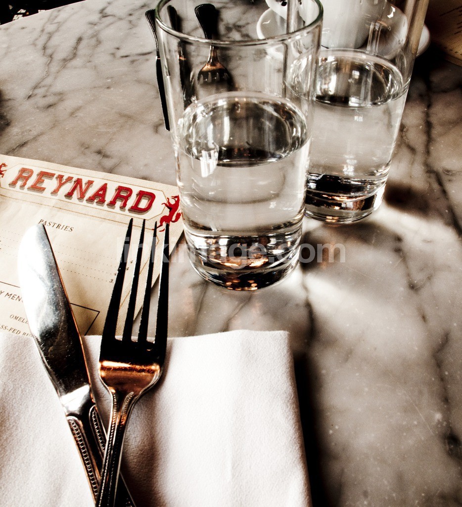 - restaurant, waterglass, menu, cutlery, table, fork, glass, knife, marble, water
