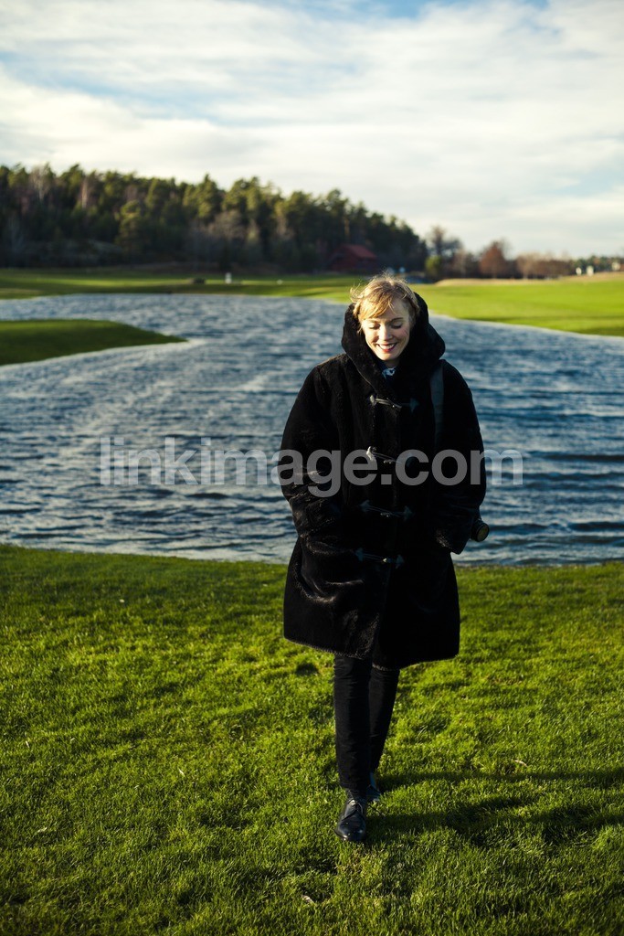 - female, girl, 25, 35, years, fall, dressed, blue, eyes, le, happy, laugh, lipsticks, blonde, sunshine, our, green, lawn, reed, lake, windy, wind, golf course, duffel, walk
