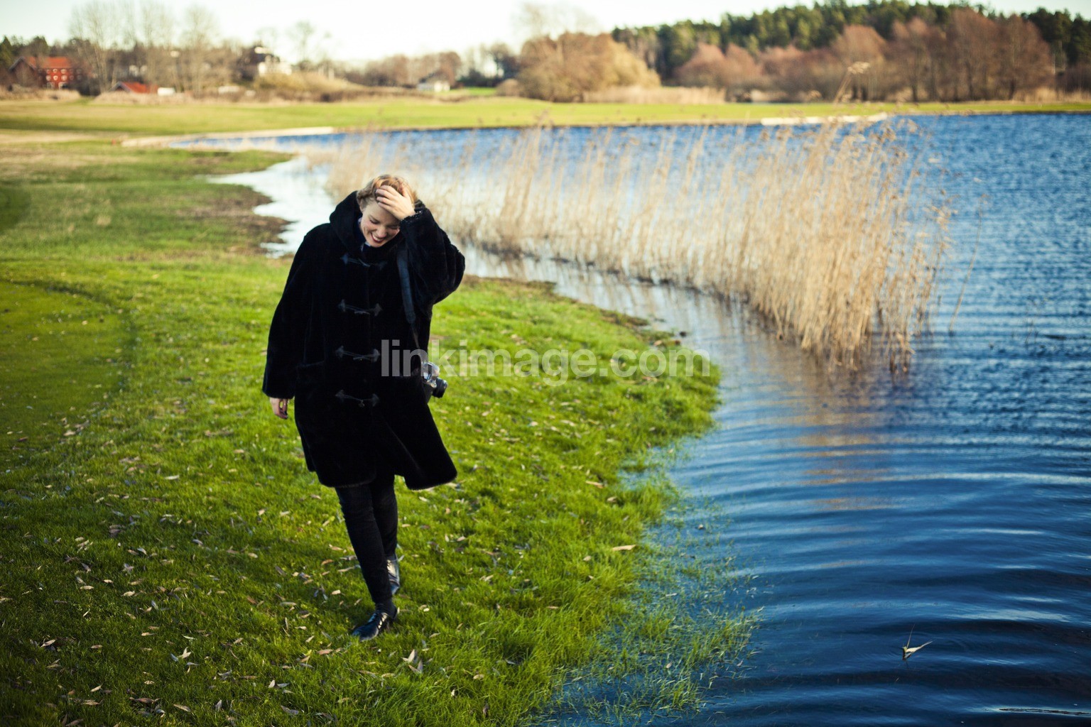 - female, girl, 25, 35, years, fall, dressed, blue, eyes, le, happy, laugh, lipsticks, blonde, sunshine, our, green, lawn, reed, lake, windy, wind, golf course
