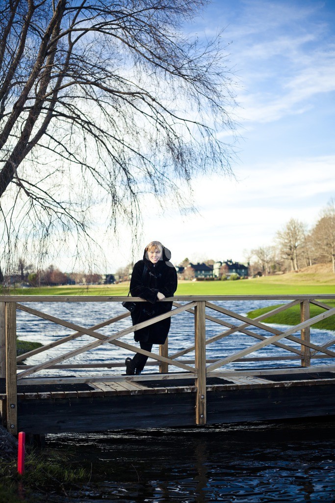 - female, girl, 25, 35, years, fall, dressed, blue, eyes, le, happy, laugh, lipsticks, blonde, sunshine, our, green, lawn, bridge, lake, break, wind, golf course, rest