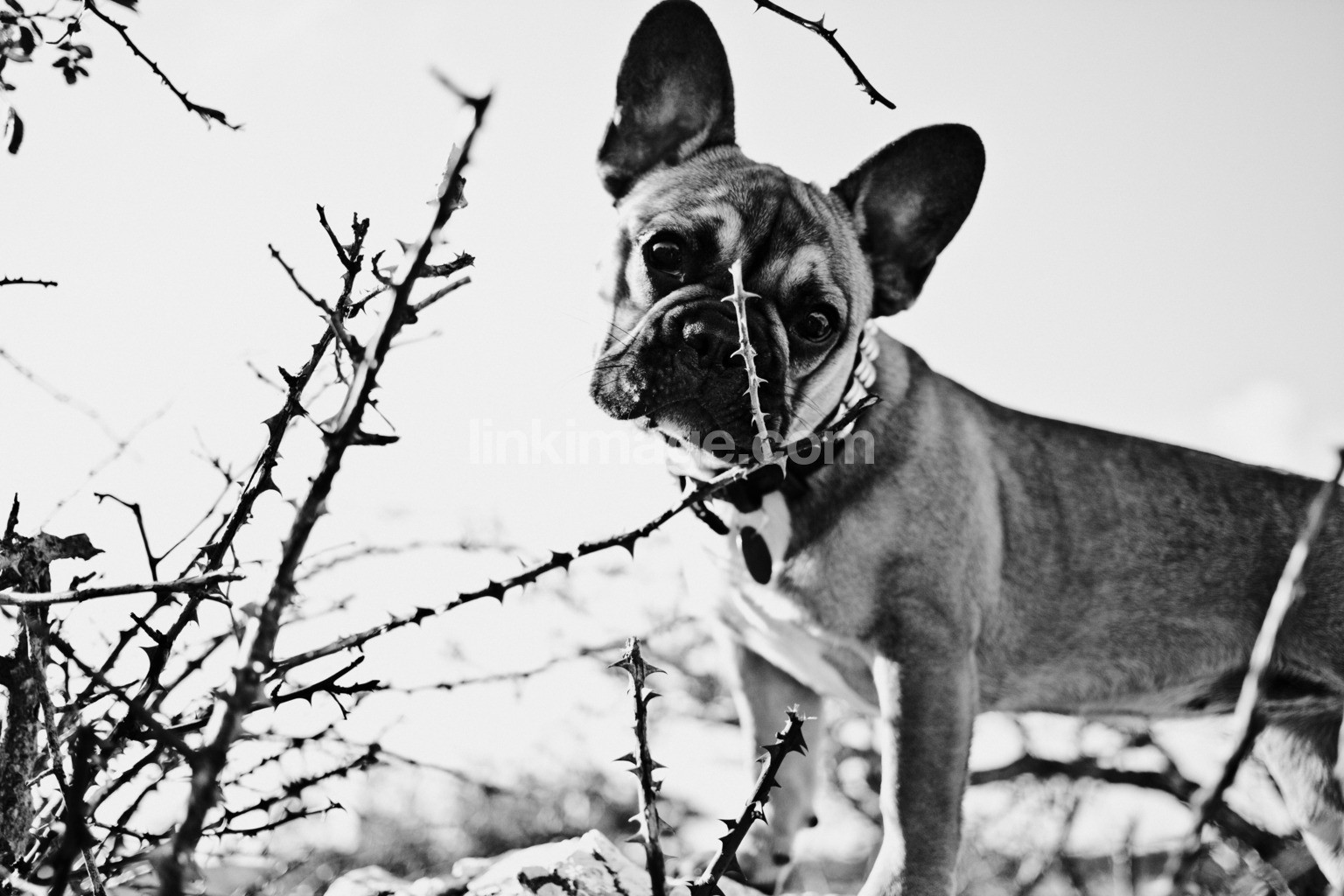- dog, french bulldog, tag, thorn, shrubbery, shrubs, stickig, eye contact, pet