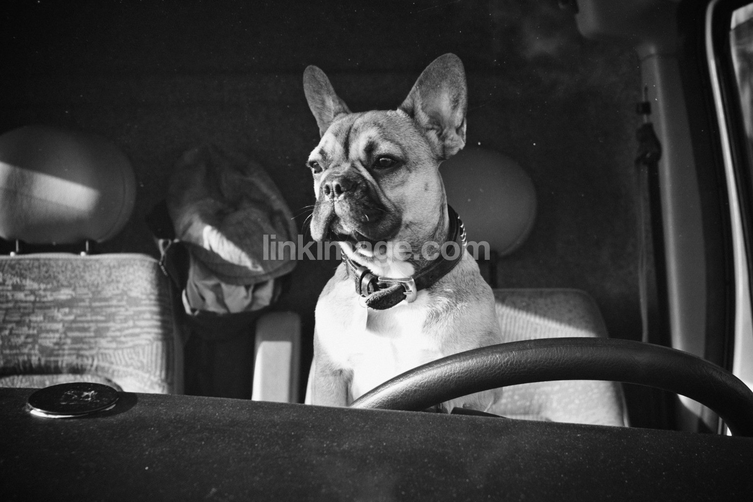 - car, steering wheel, dog, french bulldog, pet, sunny, driver, animals, see, up, view, black and white, bw