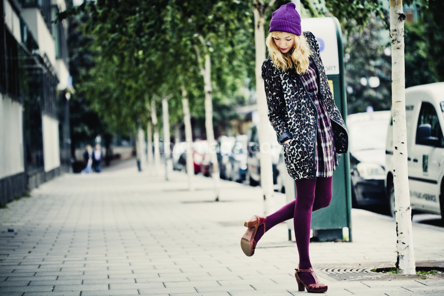 - female, girl, 25-35 years, purple, color, street style, sidewalk, leopard, pattern, sandal, shoe, brown, strumpyxor, walk