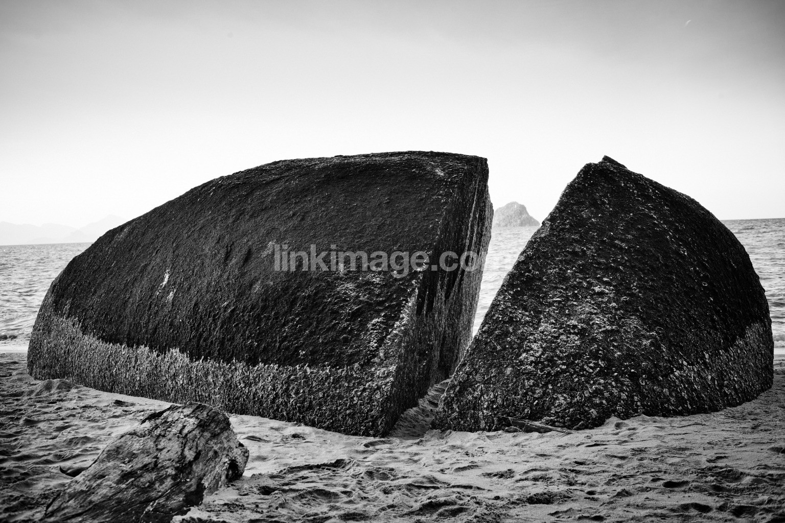 bw, black and white, stone, cut, beach, sand, water, sea, form, water's edge, sharp, shared, cracked, gap, distance