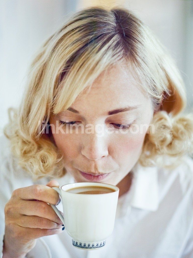 - female, 25-35 years, blonde, blue-eyed, blue, eyes, portrait, white, shirt, serious, curly hair, hairstyle, coffee cup, coffee, refreshments, hot, blister, coolness, china