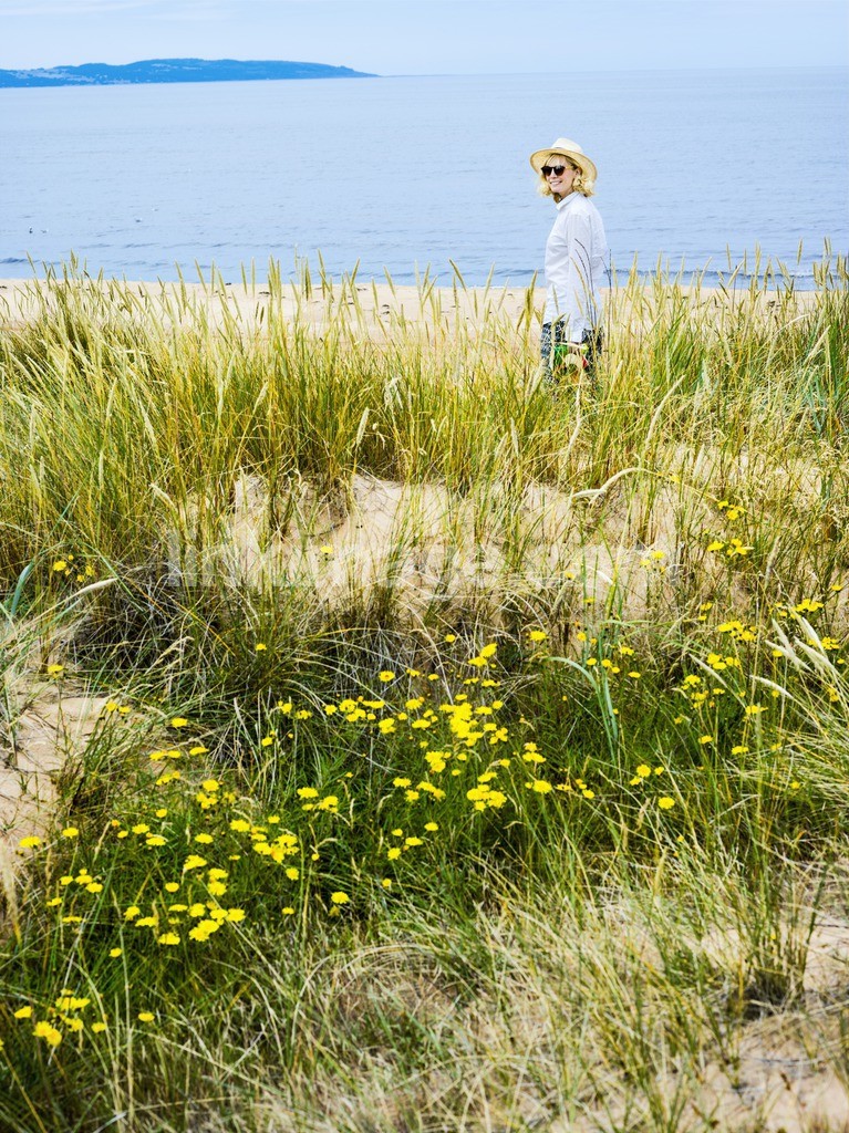 - sweden, beach, sand, sea, blue, hill, grass, view, sea views, heaven, bright blue, skyline, peacefully, calm, roses, mindfulness, alone, single, female, 25-30 years, straw hat, hat, sunglasses, happy, satisfied, shirt, walk, excursion, private, smile, laughter, blonde, swedish