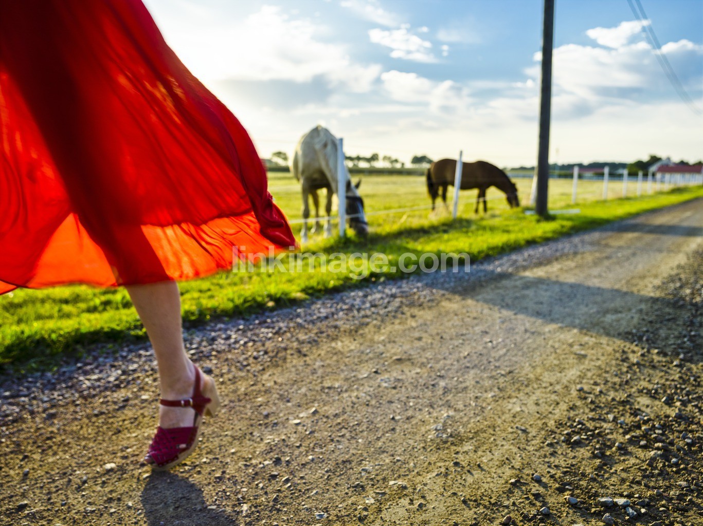 nature, horse, rural, pony, summer, bait, free, sunshine, sun, greenery, riding, animal husbandry, agriculture, grass, meadow, grass pasture, idyll, agricultural, road, fence, bright blue, heaven, female, girl, red dress, summer dress, 25-35 years, blonde, form, color