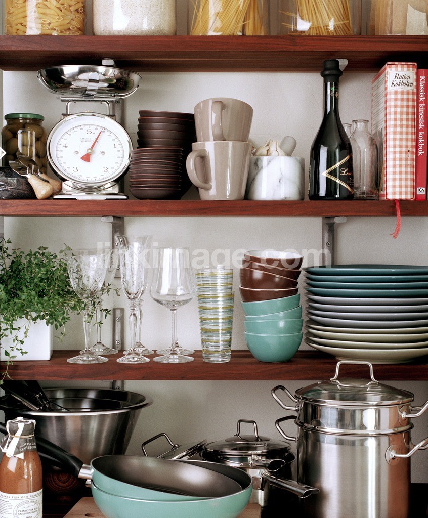 - kitchens, shelves, pantry, dinnerware, pasta, glass jars, rice, balance, entered, mugs, wine, champagne, cookbook, rosemary, wineglass, bowls, dishes, pots, pans, interior
