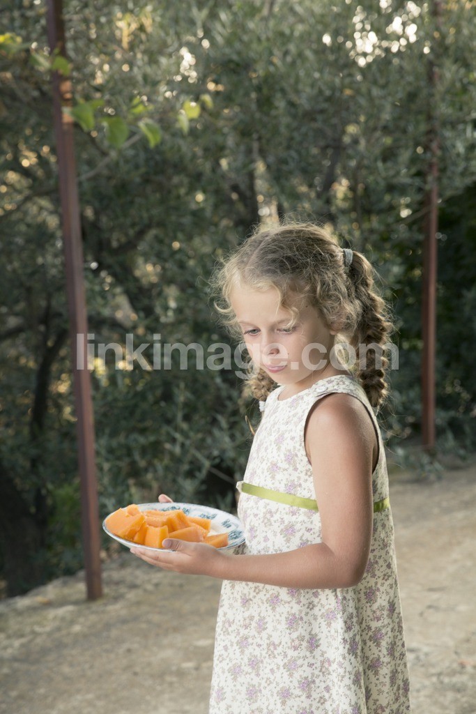 - girl, child, summer vacation, dress, summer dress, childhood, braids, blond hair, barrel wear, help to succumb, set the table, melon