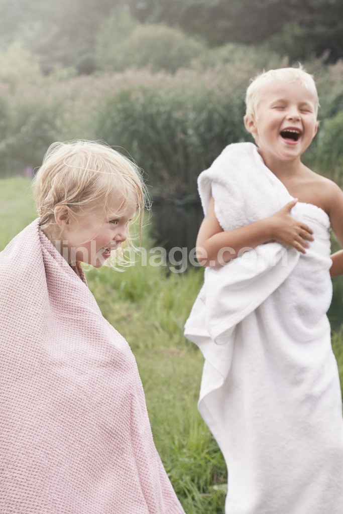 - child, girl, boy, mischievous, howl, screams, laughter, excited, joy, towel, badhanduk, pink, white, blonde, light hair, sweden, summer, summer vacation, swim, nature, forest, småland, siblings, friends, best friends, play
