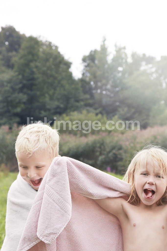 - child, girl, boy, mischievous, howl, screams, excited, joy, towel, badhanduk, pink, white, blonde, light hair, sweden, summer, summer vacation, swim, nature, forest, småland, siblings, friends, best friends, tongue, play