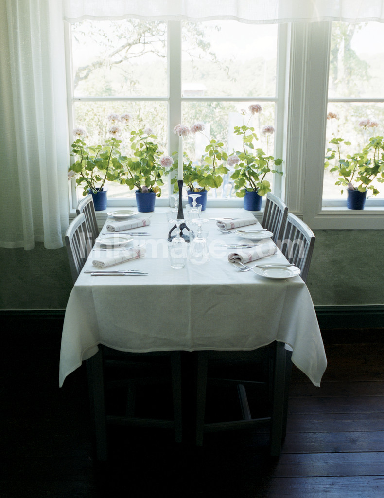 - interior, restaurant table, pelargoniums, napkins, romantic, summer, gotland