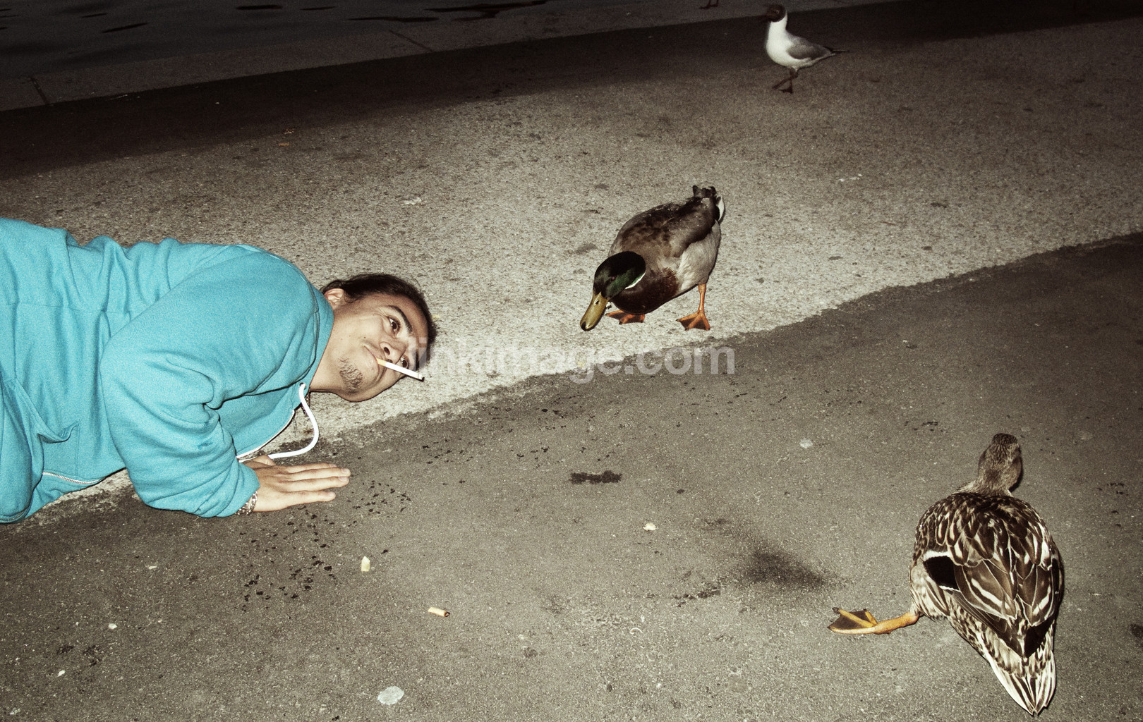 - and, lightning bolt, cigarette, birds, street, guy, one, night, ducks