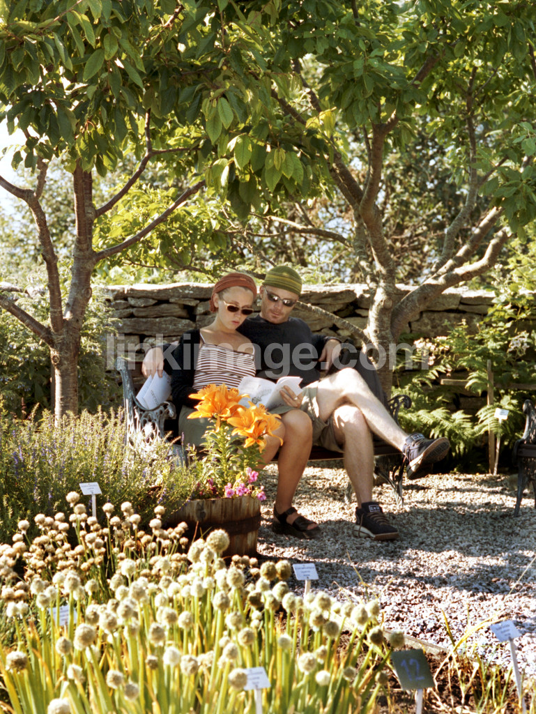 - Couple sitting on the couch in the garden in krusmyntagården on gotland, sweden, 2002.
