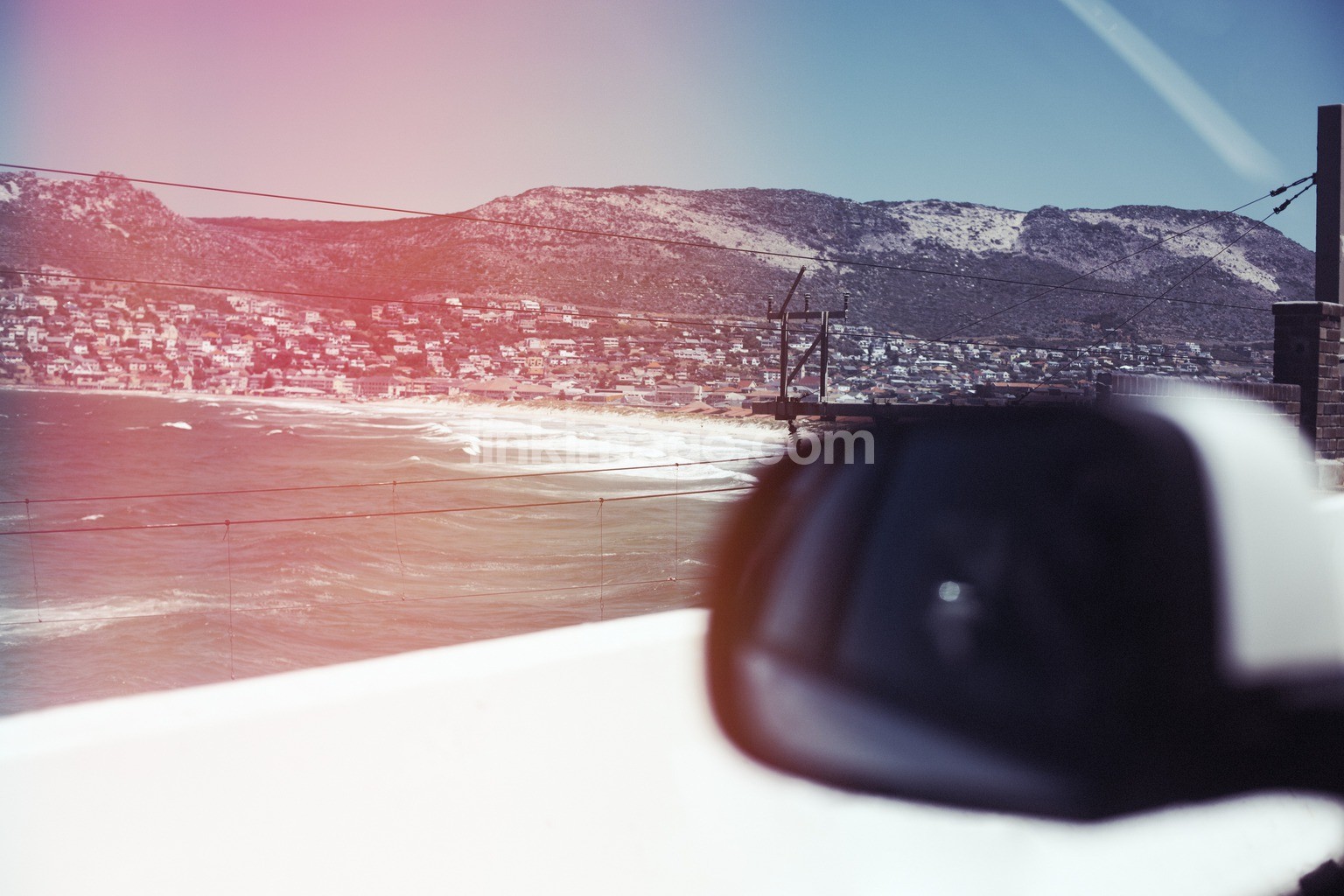 - summer, sunlight, beach, mountain, town, coastal, sea, light elements, pink, rearview mirror, excursion