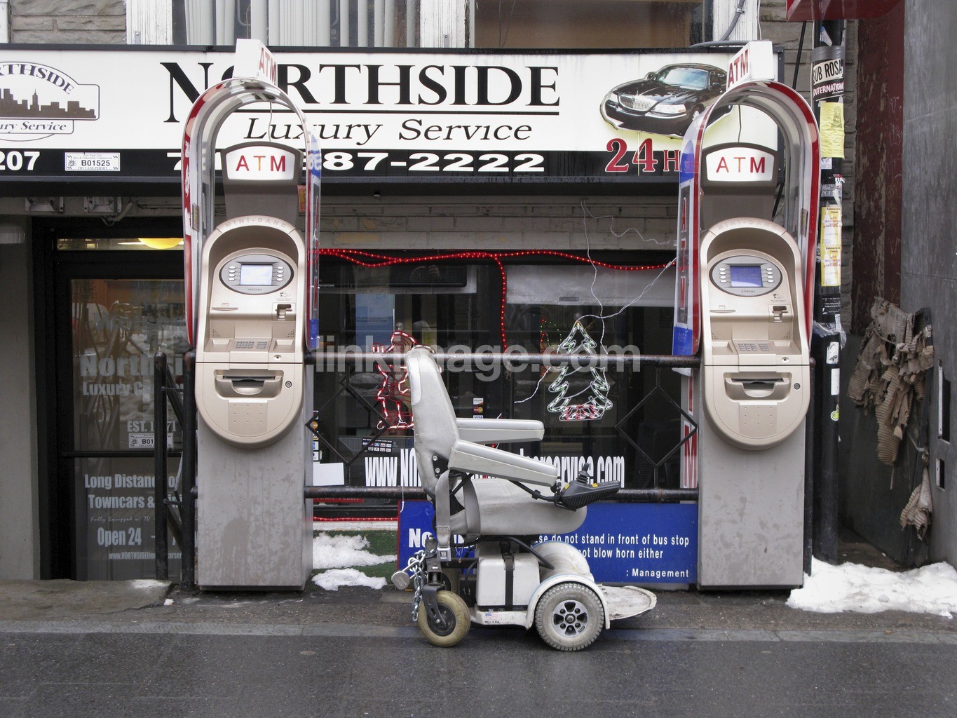 - atm, car, brooklyn, exterior, facade, old, environment, new york, permobil, walker, society, sick, town, still life, carriage, urban, usa, rental, winter