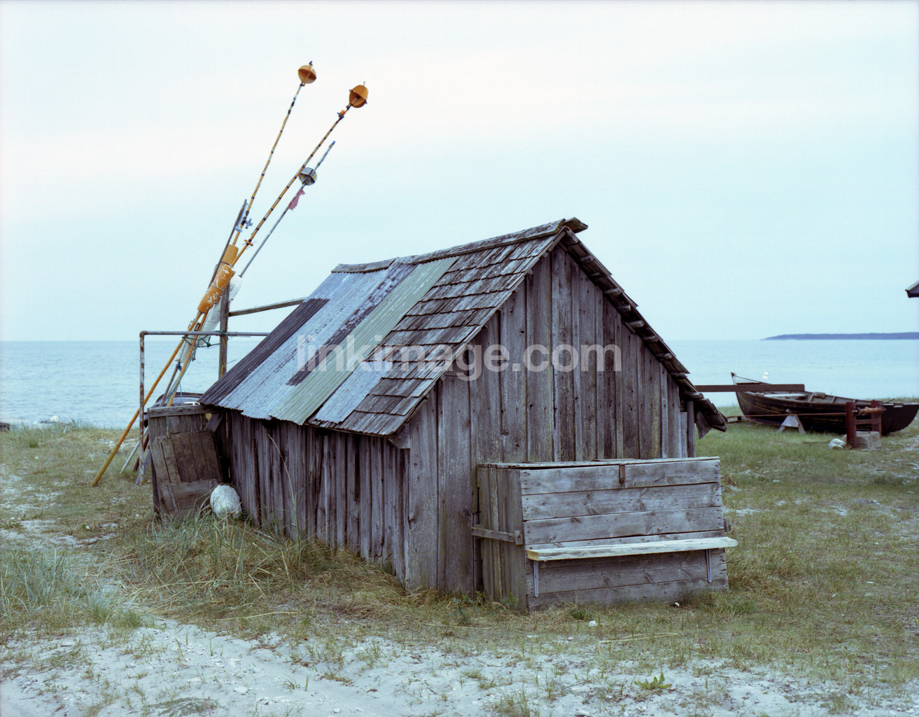 cottage, house, shed, country, lake, sea, coast, island, gotland, shore, worn, sky, bk1110