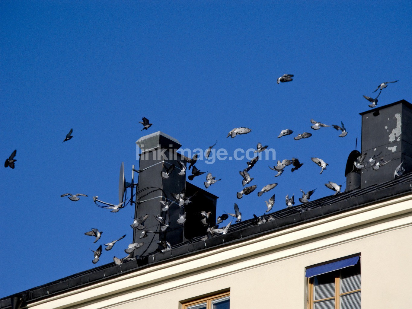- blue, housing, animals, dove, exterior, flapping, herd, fly, bird, house, land, noise, society, chimney, sunlight, sunshine, town, ceiling, urban