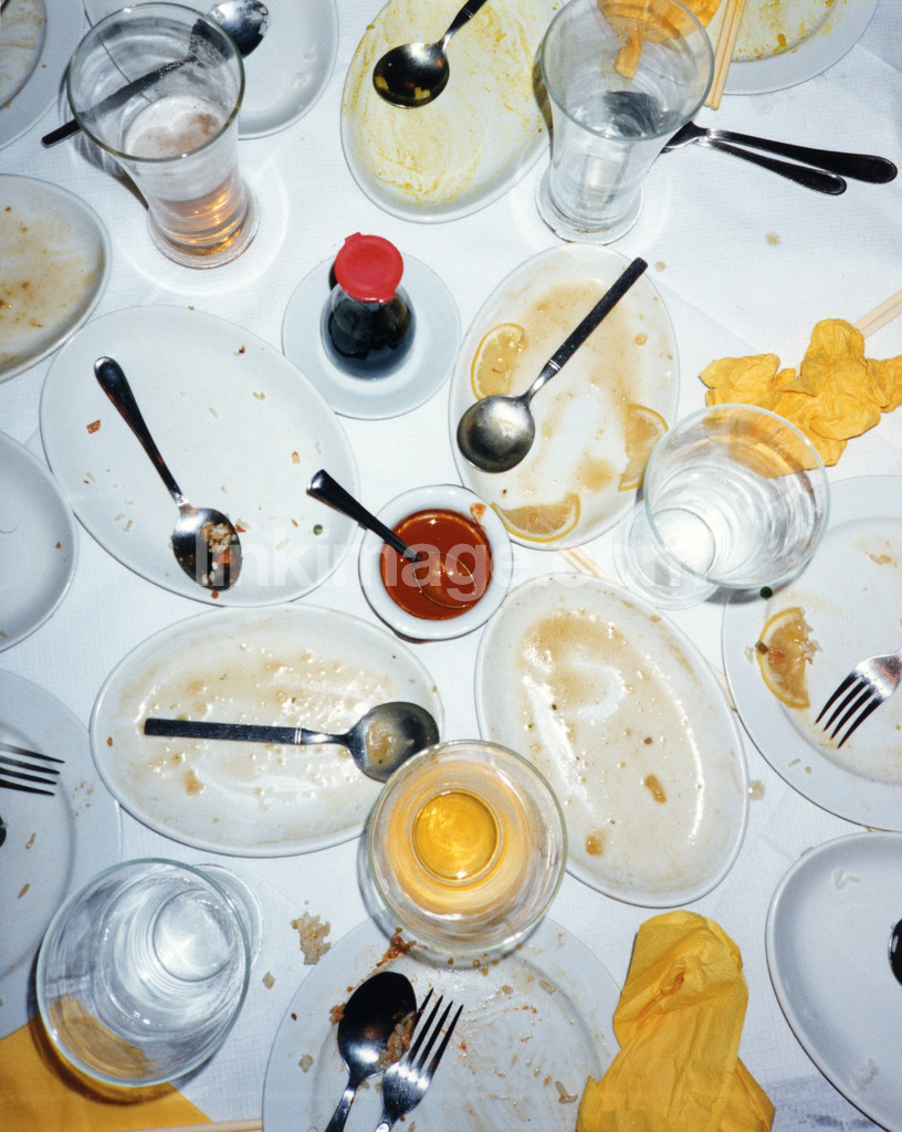 disk, dirty, fatty, plate, plates, spoon, fork, napkins, table, skitig, feed, glasses, glass, dinner, lunch, hb135