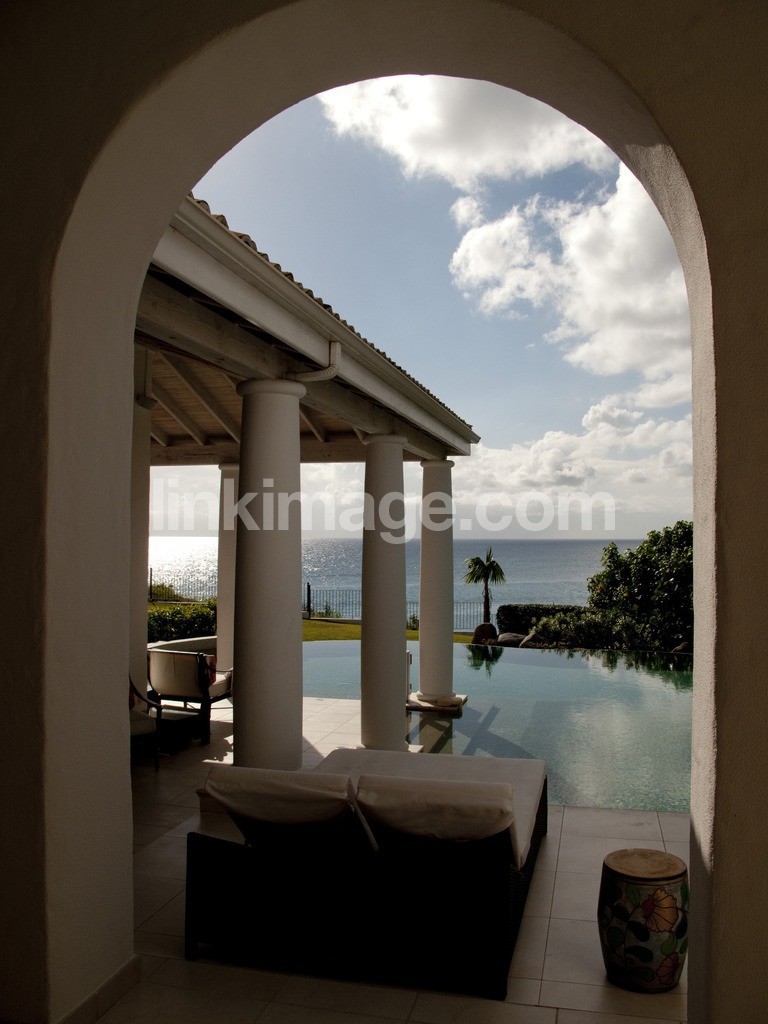 relaxed, blue, building, green, sea, heaven, house, pillar, swimming pool, vacation, sol, summer, wind, plants