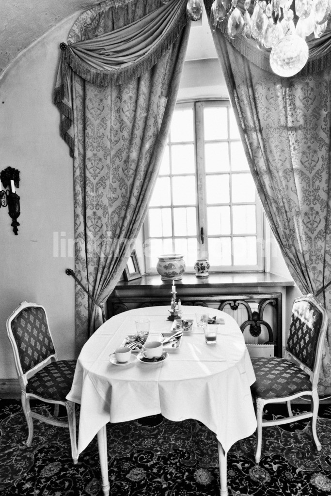 - castle, coffee, cup, mansion, curtain, lavish, crystal chandelier, tablecloth, monster, couple, two, left behind, disk, mullion, window, sunlight, black and white, table, interior, moderation, room, chairs