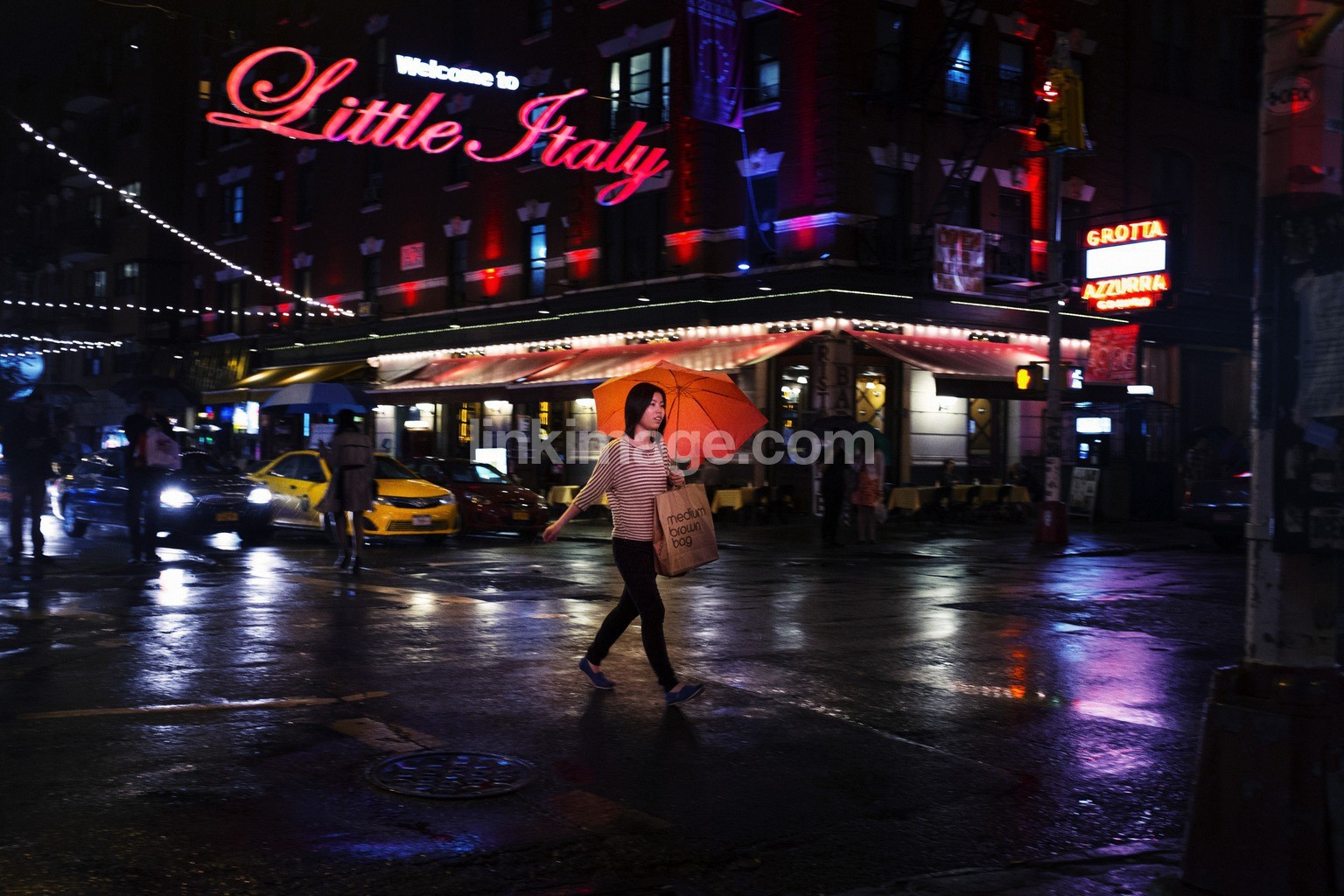 - street, night, umbrella, rain, shopping, traffic, wave, transitional place, female