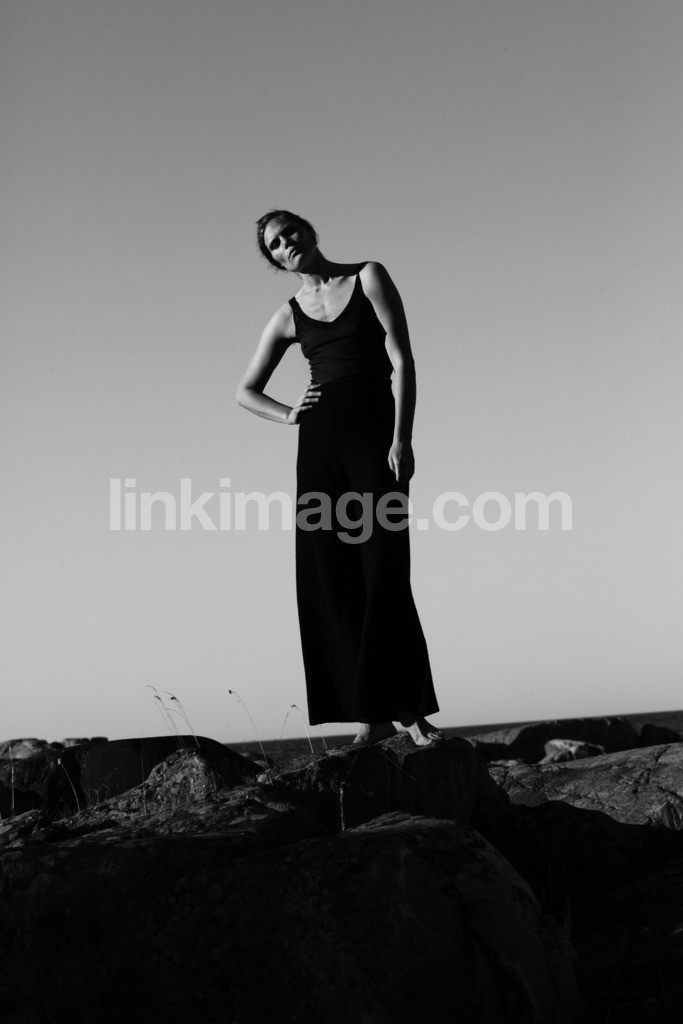 - brunette, pants, day, sea, horizon, lovely, cliffs, female, landscape, mature, pose, scandinavia, archipelago, summer, black and white, girl, outdoor, beautiful, far, sky, contrasts, feeling