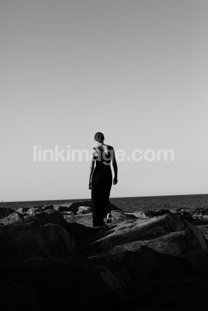 - brunette, pants, day, sea, horizon, lovely, cliffs, female, landscape, mature, pose, scandinavia, archipelago, summer, black and white, girl, outdoor, beautiful, far, sky, contrasts, feeling