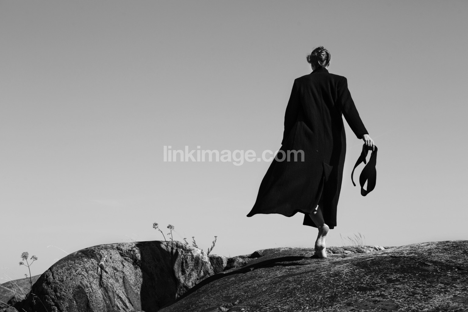 - day, sea, whole body, horizon, cliffs, female, walk, coat, sun, summer, black and white, sweden, girl, outdoor, beautiful, wind, sky, cut, contrasts, archipelago