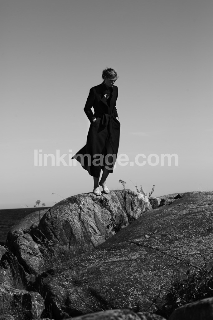 - day, sea, whole body, horizon, cliffs, female, walk, coat, sun, summer, black and white, sweden, girl, outdoor, beautiful, wind, sky, cut, contrasts, archipelago