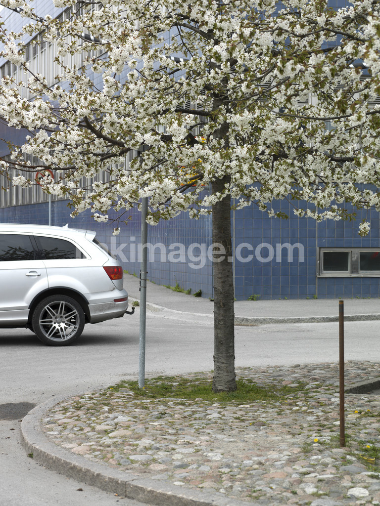 concrete, buildings, centre, suburb, car, flowers, building, facade, cobblestone, drive, cherry tree, summer, wire, wave, our