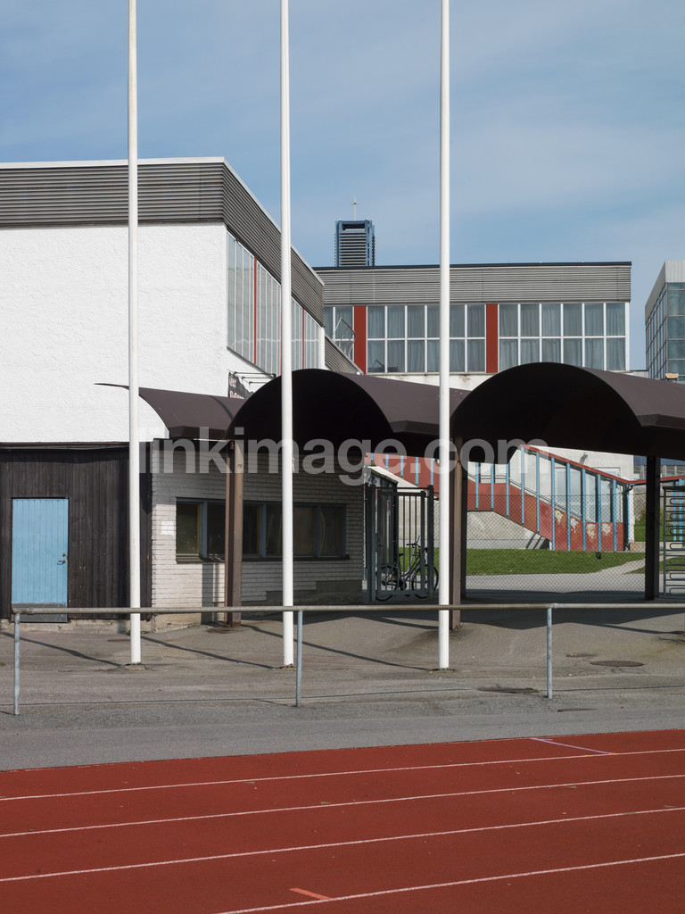 - concrete, buildings, centre, suburb, work, blue, construction work, flagpoles, flagpole, sky, construction, shopping center, ground, red, täby, ley