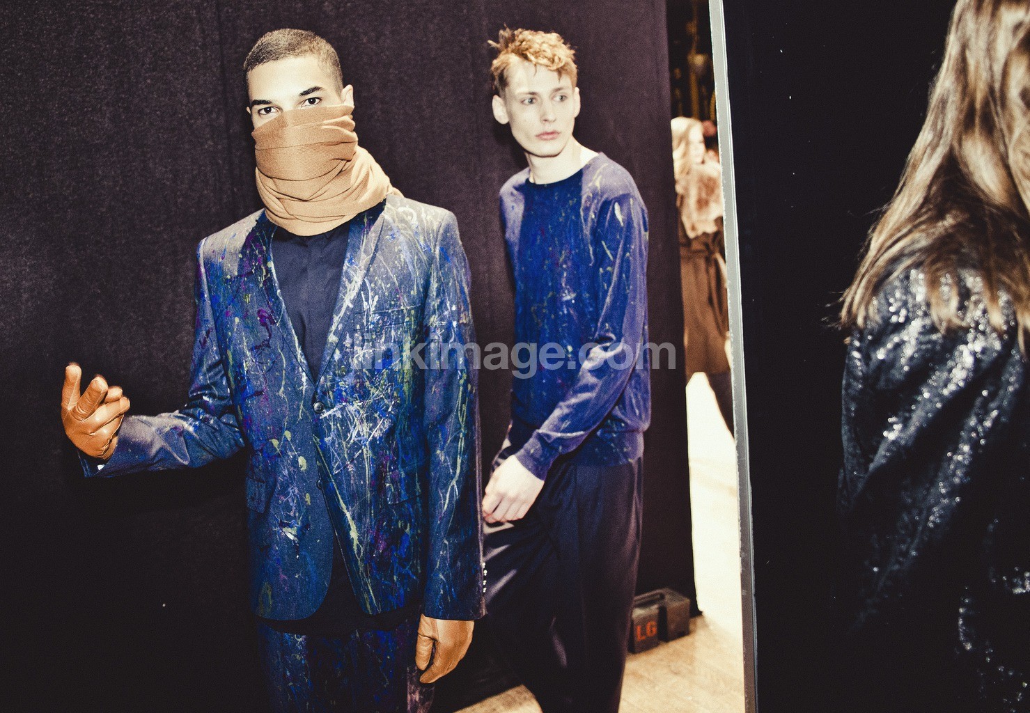 fashion, fashion, fashion week, model, models, backstage, behind the scene, preparation, show, pose, stress, artists, styling, stylist, style, fashion blogger, blogger, stylists, beauty ideals, textile, model boys, two guys, 16-20 years, jacket, splash, blue