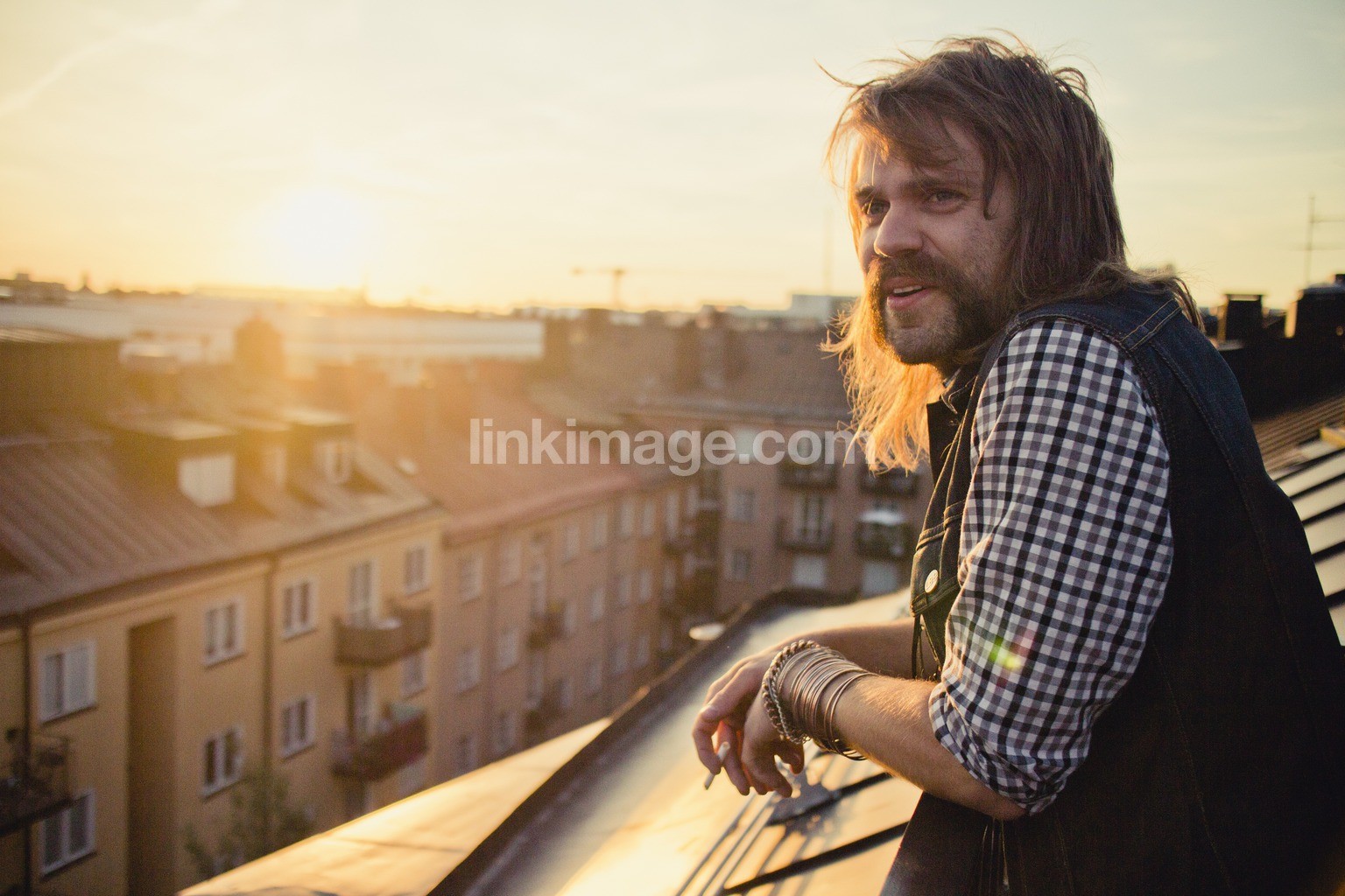 - roof terrace, balcony, summer, view, evening light, sunset, rooftop, a man, guy, 30-40 years, beer, glass, aw, after work, happy, satisfied, rock style, denim vest, fashion style, checked, sky, hair, man, shirt, beard, sun, sunlight, ceiling, terrace