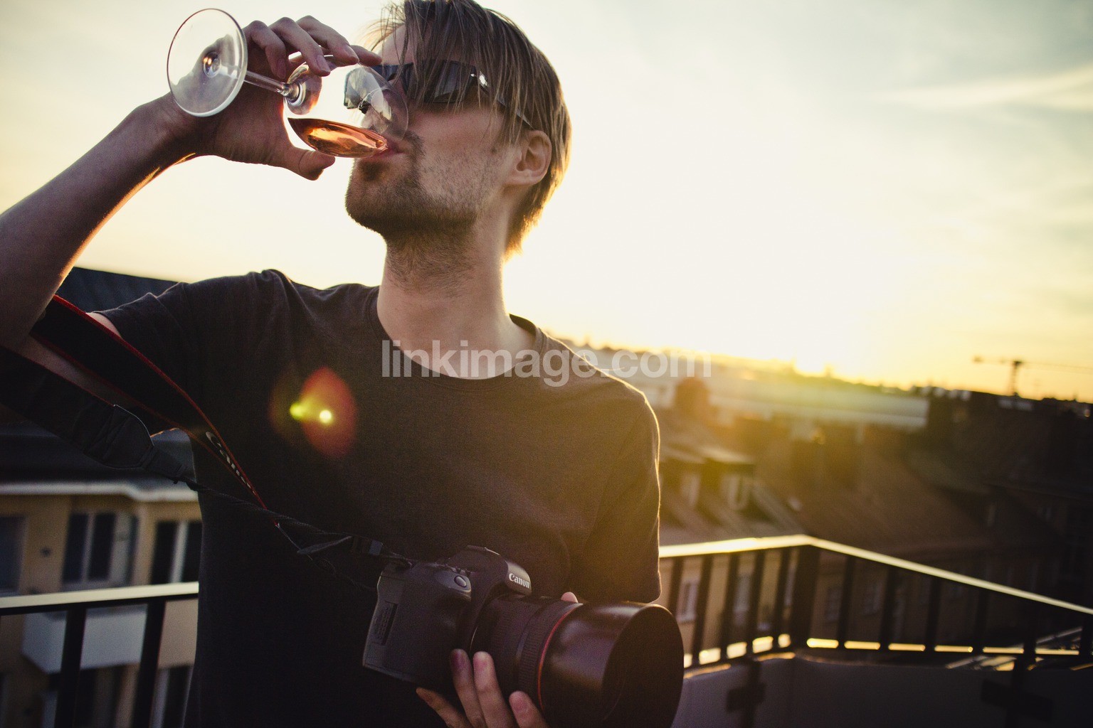 - roof terrace, balcony, summer, view, evening light, sunset, rooftop, photograph, camera, canon, wine glass, sunglasses, drink, man, opposing sun, sunlight, ceiling, terrace, wine, heat