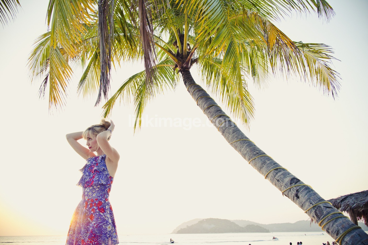- beach, sunset, holiday, enjoy, paradise, sea, indian ocean, 25-35 years, palm, island, blue, dress, blonde, sky, woman, palm trees, summer, heat