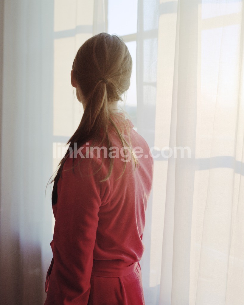 - woman, housecoat, motjus, turned away, pony tail, window, curtain, sunday, quiet, rest, contemplation, light, still, calm, looking