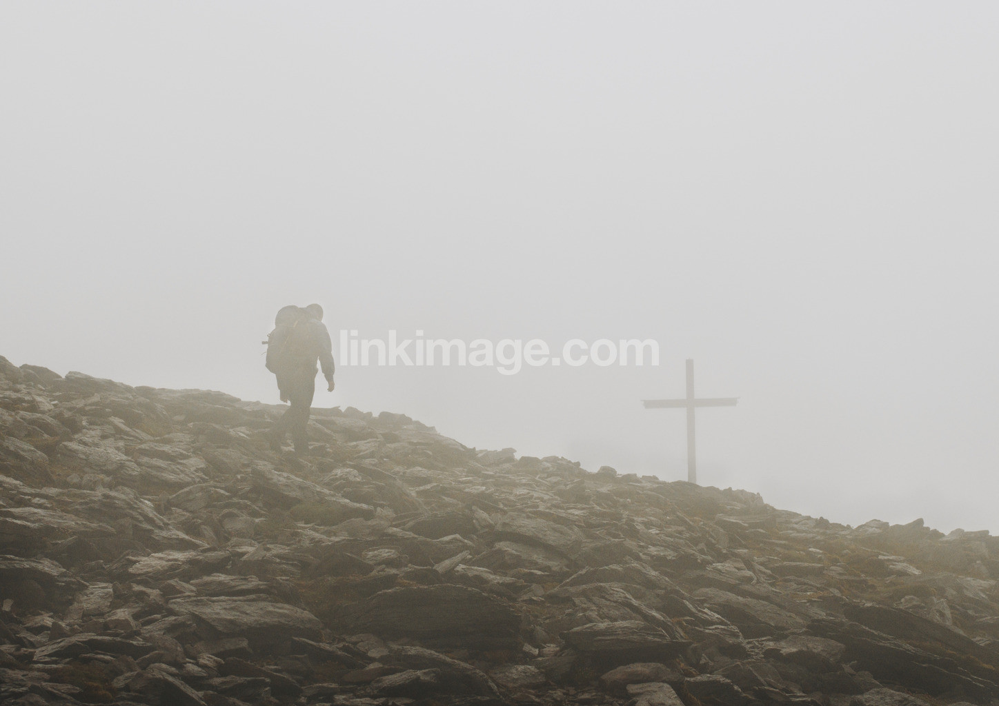 - religion, smog, top, carrauntoohil, spiritual, effort, hill, mountain, fog, alone, conquer, half-way, high, height, ireland, catholic, cross, christian, crucifix, far, miracle, cloud, goal, nature, accomplishment, trip, stone, believe, view, hike, wild, wave