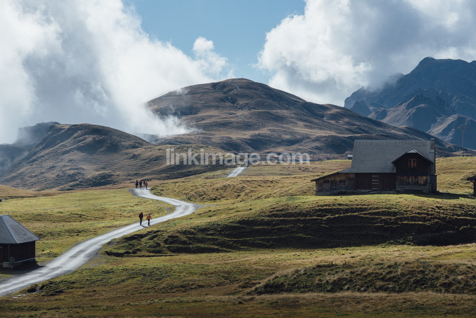 - alps, distance, mountain, residence, fog, go, house, high, height, hill, landscape, cloud, people, nature, trip, summer, outside, view, hike, wilderness, wave