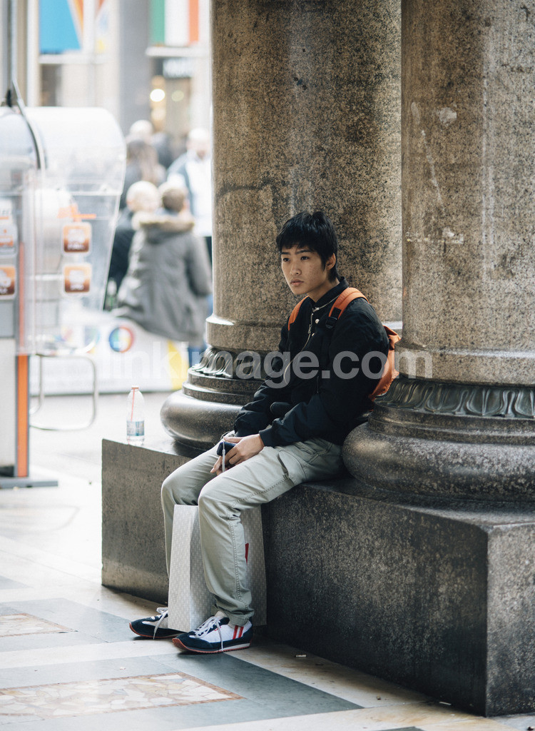- city, asian, alone, is, pillar, boy, backpack, serious, stone, teenager, tourist, tanker, waiting